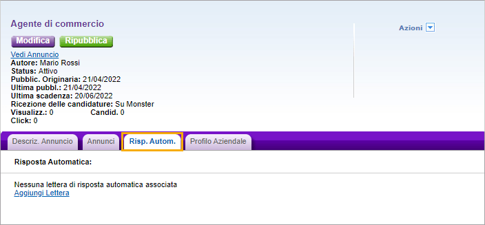 - Fai clic sul titolo dell’annuncio a cui desideri aggiungere la lettera. Seleziona la scheda Risposta automatica e fai clic su Aggiungi Lettera.