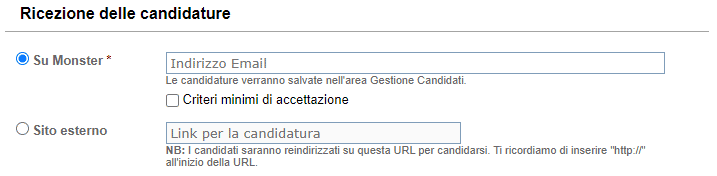 - Sito Esterno – rimanda i candidati al tuo ATS. Per impostare questo metodo di ricezione, inserisci il link al tuo ATS nel campo fornito. In questo caso Monster terrà traccia solo del numero di click sul tasto ‘candidati’