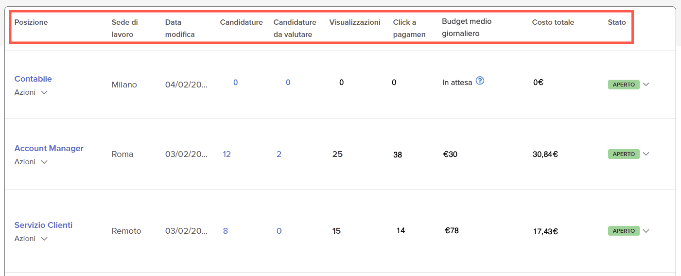 - Posizione – Qui puoi vedere il titolo della posizione. Cliccaci sopra per monitorare l’andamento dell’annuncio. Controlla la sezione in questo articolo “Analizzare le performance” per saperne di più.
